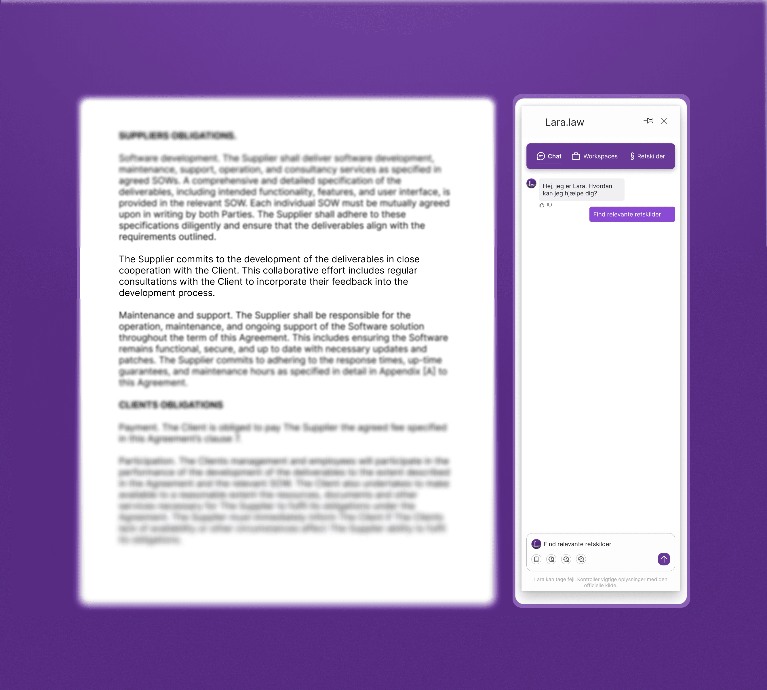 AI-assisteret kildesøgning der giver hurtige og præcise svar på juridiske spørgsmål på baggrund af jeres egne og offentlige kilder. Lara kan på få minutter pege i den rigtige retning og opsummere kompliceret dansk og international retspraksis.